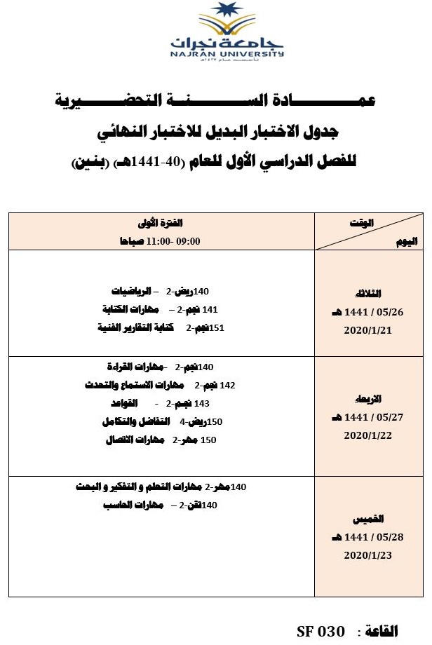 Deanship Of Preparatory Year Guideline جدول الاختبار البديل للاختبار النهائي الفصل الدراسي الأول للعام الجامعي 1440 1441 هـ بنين الإعلانات