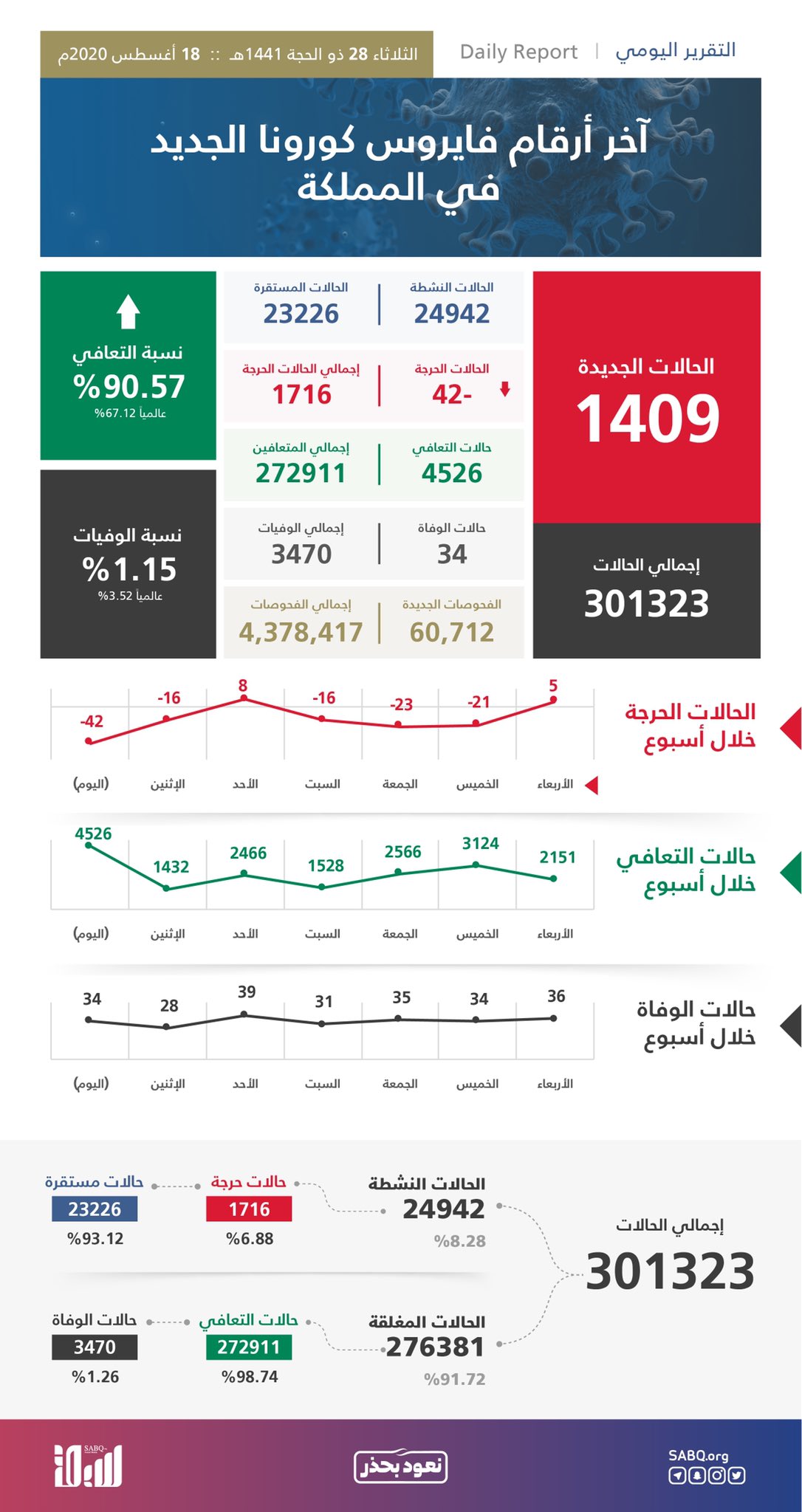 صحيفة سبق تطورات أرقام كورونا في المملكة الثلاثاء 18 أغسطس 2020 عاجل